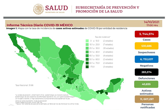 De acuerdo con el reporte técnico diario, actualmente hay 40 mil 835 casos activos estimados, es decir, personas que iniciaron con síntomas en los últimos 14 días y que podrían transmitir el virus.