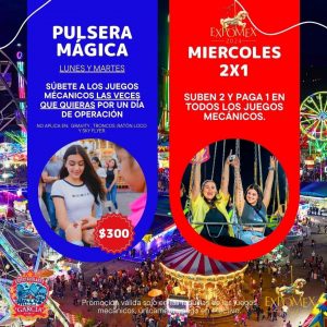 🎡 Pulsera Mágica: Lunes y martes, disfruta de TODOS los juegos que quieras durante todo el día (excepto Gravity, Troncos, Ratón Loco y Sky) por solo $300 pesos. ¡Aprovecha y repite tus favoritos! 😎