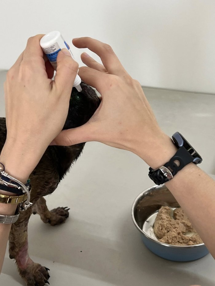 Durante la evaluación oftalmológica se detectaron dos úlceras en cada ojo, por lo que actualmente recibe tratamiento especializado. La atención fue brindada con el apoyo de la doctora Alejandra, oftalmóloga veterinaria del centro Okami Pet Resort, quien otorgó la consulta de manera solidaria.