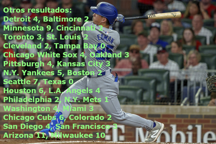 El dominicano Teoscar Hernández, Tommy Edman y Max Muncy conectaron jonrones consecutivos durante el rally de la novena entrada, que comenzó contra el cerrador cubano de los Bravos, Raisel Iglesias (5-2), quien no había permitido carrera limpia en 35 1/3 entradas antes del juego.