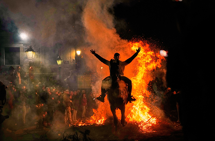 Un hombre cruza una hoguera a lomos de un caballo como parte de un ritual en honor a San Antonio Abad, el patrón de los animales, en San Bartolomé de Pinares, España, el 16 de enero de 2026. (AP Foto/Manu Fernández)