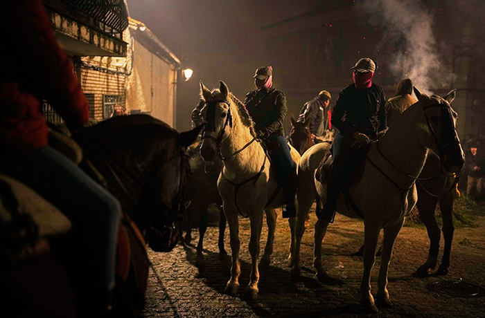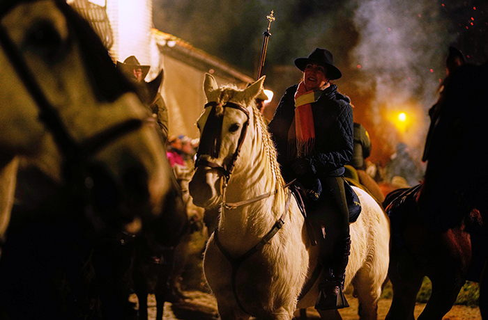 Jinetes esperan su turno para saltar sobre las hogueras en un ritual en honor a San Antonio Abad, el patrón de los animales, en San Bartolomé de Pinares, España, el 16 de enero de 2026. (AP Foto/Manu Fernández)