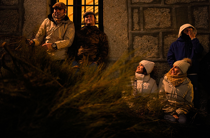 Varias personas esperan junto a los arbustos que se prenderán como parte de un ritual en honor a San Antonio Abad, el patrón de los animales, en San Bartolomé de Pinares, España, el 16 de enero de 2026. (AP Foto/Manu Fernández)