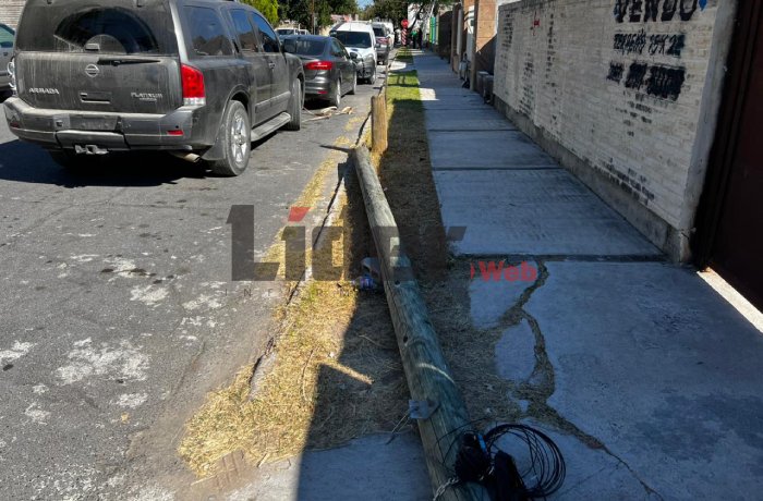 NUEVO LAREDO, TAM.- Un fuerte susto se llevaron vecinos y padres de familia de la colonia Madero, luego de que un camión de la empresa Castores derribara dos postes de madera frente a un centro educativo, cayendo uno de ellos sobre un vehículo estacionado.