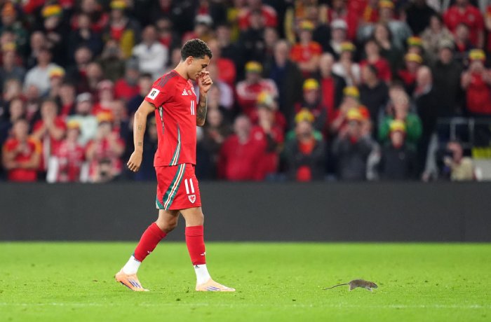 El delantero galés Brennan Johnson terminó ahuyentándolo por las líneas laterales mientras la multitud aplaudía