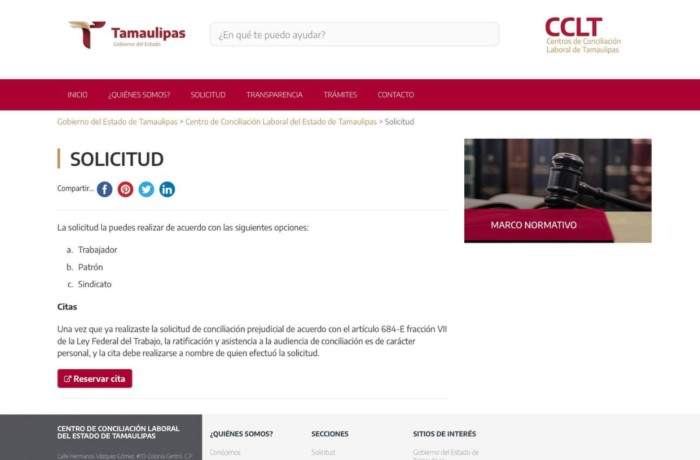 La disponibilidad de la página web pone al alcance de todas y todos los tamaulipecos las bondades de la justicia laboral, facilitando una cita de conciliación para quienes viven fuera de estos seis municipios donde se localizan las oficinas de los centros de conciliación laboral en el estado, proporcionando horario e información adicional para conocer los derechos y obligaciones de los prestadores de servicios.