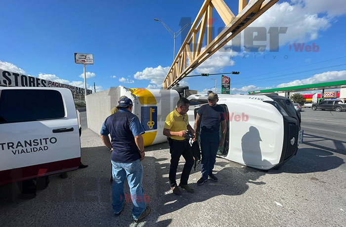 NUEVO LAREDO, TAM.- El conductor de un camioncito de carga de una tienda comercial, chocó contra el arco metálico de la Carretera Aeropuerto, quedando volcada la unidad.