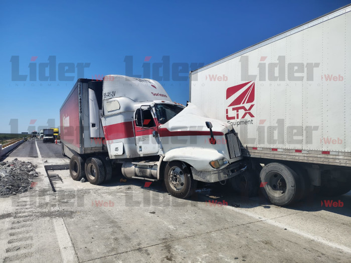 NUEVO LAREDO, TAM. – Un choque por alcance entre dos vehículos de carga provocó el cierre parcial de un tramo de la autopista a Nuevo Laredo, a la altura del kilómetro 168. El incidente involucró a unidades de las empresas Soriana y LTX.