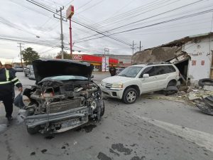 La fuerza del impacto provocó que la Mitsubishi fuera proyectada en reversa, terminando contra la fachada del inmueble donde anteriormente operaba un negocio de vidrios, causando daños estructurales adicionales.
