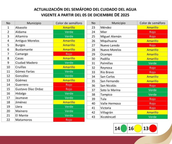 En el desglose municipal del Semáforo del Cuidado del Agua, figuran en color rojo: Camargo, Guerrero, Díaz Ordaz, Matamoros, Mier, Miguel Alemán, Nuevo Laredo, Reynosa, Río Bravo, San Nicolás, Tula, Valle Hermoso y Victoria.