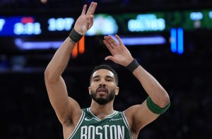 Tatum, elegido al Juego de Estrellas y que sólo encestó 12 de 42 disparos en general en Boston, logró cinco triples, ...
