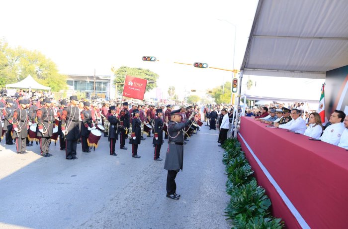 Ciudad Victoria, Tam.- Con la presentación, por primera vez, de una banda de guerra monumental integrada por 500 alumnos y alumnas de diferentes municipios, este jueves se conmemoró el desfile cívico, deportivo y militar, con la entusiasta participación de estudiantes, jóvenes, niñas y niños, en conmemoración del 115 aniversario del inicio de la Revolución Mexicana, presidido por el gobernador Américo Villarreal Anaya.