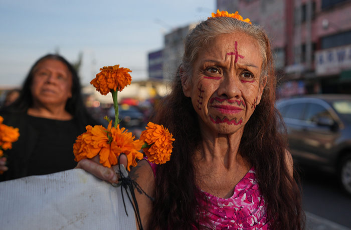 Mujeres participan en una marcha en honor a las trabajadoras sexuales fallecidas antes de las celebraciones del Día de Muertos en la Ciudad de México, el viernes 31 de octubre de 2025. (Foto AP/Claudia Rosel)