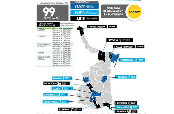 CIUDAD VICTORIA, TAM.- Durante las últimas 24 horas Tamaulipas disminuyó la cifra de contagios de COVID-19 a 99 casos y 18 fallecimientos, como resultado del reforzamiento de las medidas preventivas y el avance en la estrategia de vacunación, informó la secretaria de Salud, Gloria Molina Gamboa.