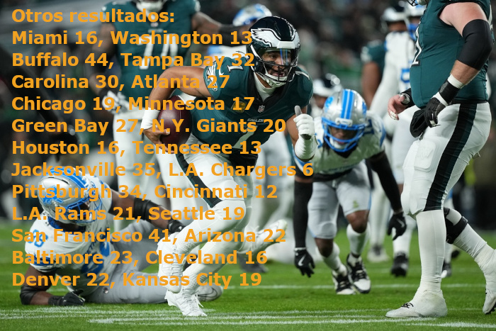 FILADELFIA (AP) — Jalen Hurts anotó el único touchdown en un esfuerzo por lo demás débil de la ofensiva de los Eagles de Filadelfia, y fue suficiente para llevarlos a una victoria de 16-9 sobre los Lions de Detroit, quienes fallaron en todos sus intentos en cuarta oportunidad el domingo por la noche.