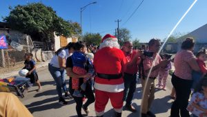 Durante el recorrido, dos personas caracterizadas como Santa Claus acompañaron a los agentes, convivieron con los menores y ayudaron a crear un ambiente festivo en cada uno de los puntos visitados.