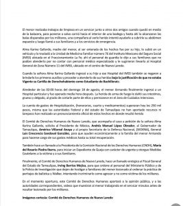 Finalmente, el Comité de Derechos Humanos de Nuevo Laredo, hace un llamado enérgico al Fiscal General del Estado de Tamaulipas, Irving Barrios Mojica, para que ordene al personal del Ministerio Público y de la Policía de Investigación que dejen de hostigar a familiares del menor lesionado al ordenar la práctica de peritajes de balística y Walker, intentando incriminarlo como agresor y no como víctima de los militares.