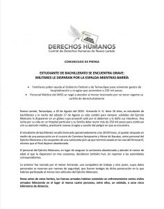 Nuevo Laredo, Tam. Amando H. G. tiene 16 años, es estudiante de bachillerato y la noche del sábado 17 de Agosto su vida cambió para siempre: soldados del Ejército Mexicano le dispararon en un glúteo cuyo proyectil salió por el abdomen y le dañó sus intestinos. Hoy lucha por su vida en un Hospital particular y su familia debe reunir más de 250 mil pesos para continuar con su atención médica, practicarle nuevas cirugías y sacarle del peligro en que se encuentra.