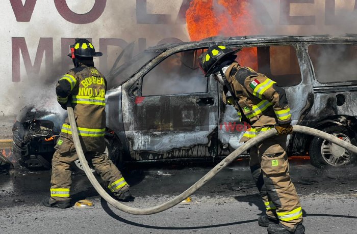 Elementos del cuerpo de Bomberos acudieron al sitio y realizaron las maniobras necesarias para sofocar las llamas que envolvían una camioneta Chevrolet Venture modelo 2002, la cual quedó severamente dañada.