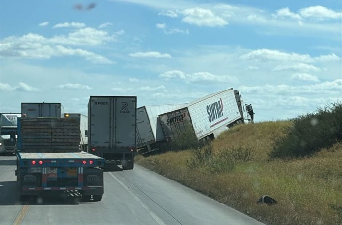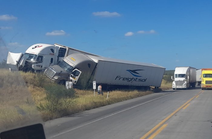 NUEVO LAREDO, TAM.- Un accidente vehicular entre dos tráileres se registró este miércoles en el área conocida como “Uno y Uno” en el Libramiento Mex 2. El choque, que ocurrió de costado, dejó uno de los vehículos en una posición precaria, a punto de volcarse.