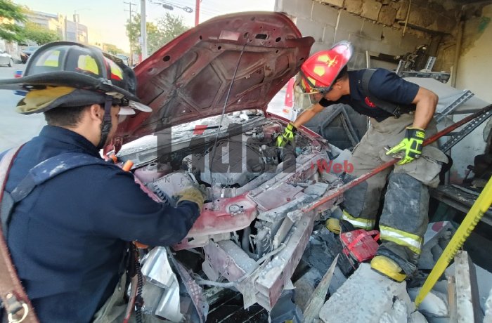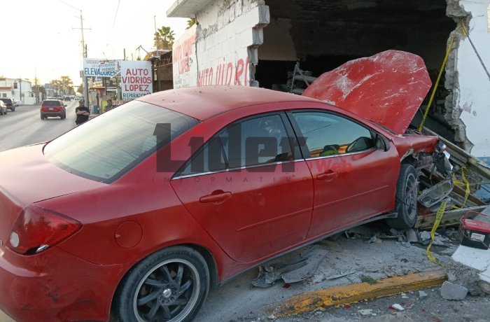 Mientras tanto, el Pontiac continuó su trayectoria fuera de control y se impactó de frente contra la pared de una propiedad ubicada en el número 1956-B de la avenida Niños Héroes, estructura que ya mostraba daños previos por un choque anterior.