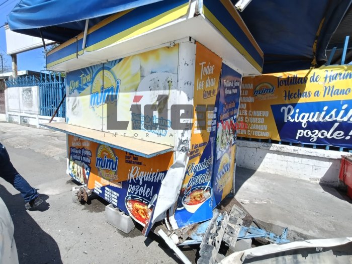 Tras la colisión, el Ford Fusion perdió el control y se proyectó contra el puesto de tacos “Mimi”, ocasionando daños materiales en la estructura del negocio instalado en la vía pública.