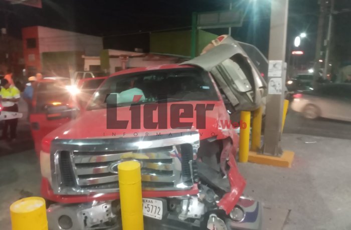 NUEVO LAREDO, TAM.- Un fuerte accidente se registró en el cruce de la calle Perú con la avenida Obregón, cuando un conductor se pasó la luz roja del semáforo y colisionó contra una camioneta. El impacto fue tan fuerte que el vehículo quedó montado sobre la caja de la camioneta, generando una escena impactante en el lugar.