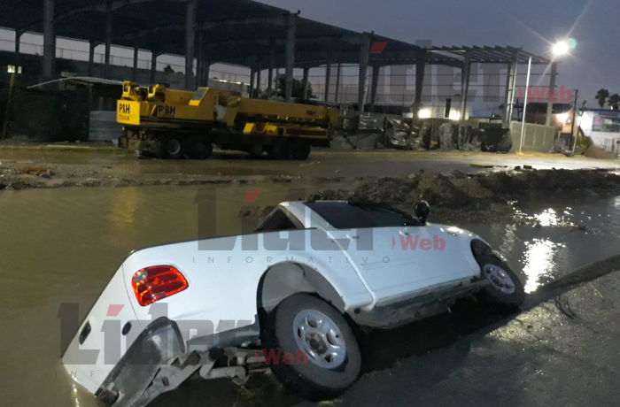 NUEVO LAREDO, TAM.- Por no respetar los señalamientos restrictivos de una obra en proceso, el conductor de una camioneta cayó en la misma, cuando se encontraba inundada por la intensa lluvia que cayó en esta frontera.