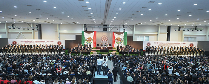 Durante la sesión pública, extraordinaria y solemne del Congreso del Estado, en el Polyforum de esta capital, y luego de la toma de protesta de las y los 147 magistrados y magistradas y juezas y jueces, a cargo del presidente de la Junta de Gobierno, diputado Humberto Prieto Herrera, el gobernador destacó que este acto deja para la posteridad y una imagen inédita, con la concurrencia del pleno de los tres Poderes del Estado, “pero esta vez todos con la legitimidad democrática y la autoridad moral que otorga el respaldo del pueblo”, expresó.