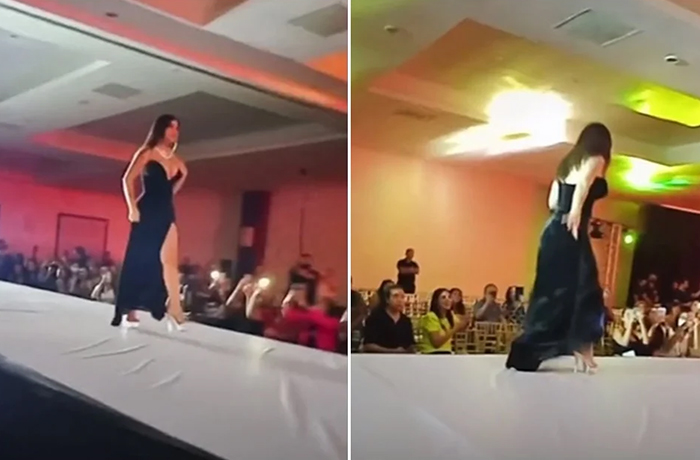 Segundo más adelante se puede ver a Karely tropezar levemente con su vestido, pese al accidente ella siguió modelando.