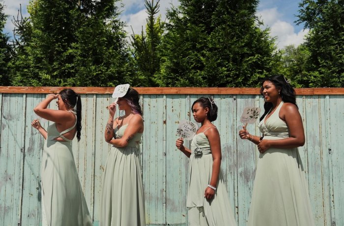 Damas de honor usan abanicos para protegerse del sol y refrescarse durante las fotos nupciales antes de una boda, el 23 de agosto de 2025, en Newtown, Ohio. (AP Foto/Joshua A. Bickel, archivo)