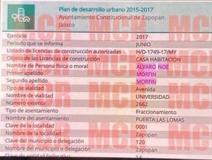 Por otro lado, un documento del Ayuntamiento Constitucional de Zapopan, Jalisco, correspondiente al Plan de Desarrollo Urbano 2015-2017, detalla que en junio de 2017, Álvaro Noé Morfín obtuvo una licencia de construcción para una casa habitación en el fraccionamiento Puerta Las Lomas, en Zapopan. La licencia, registrada bajo el folio H/D-1749-17/MY, indica que el proyecto, valuado en 84,364.41 pesos, fue autorizado para una vivienda unifamiliar de 484.46 m², con un costo total de construcción estimado en 7,957.24 pesos por metro cuadrado. El director responsable de la obra fue el arquitecto Ricardo Castillo Santana.