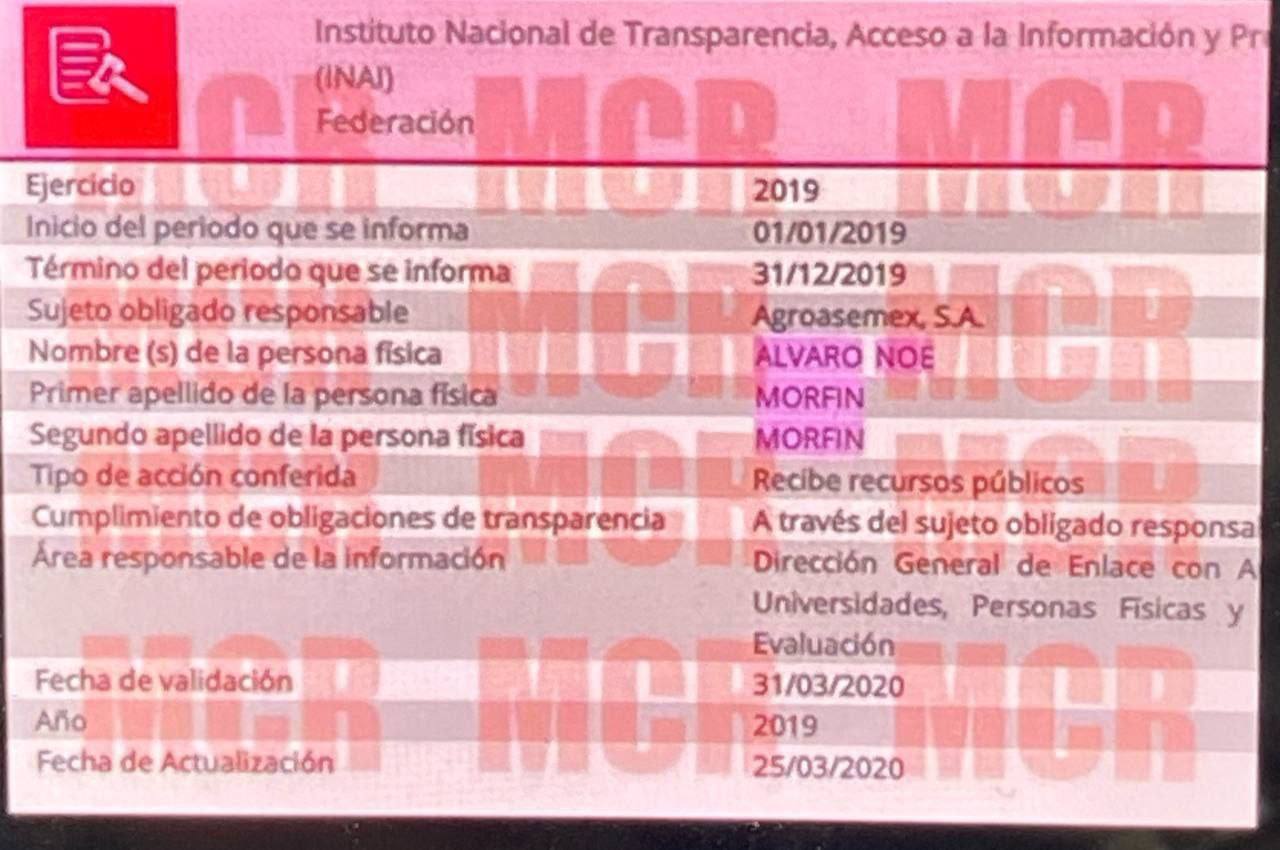 De acuerdo con un informe del INAI correspondiente al ejercicio 2019, Álvaro Noé Morfín recibió recursos públicos entre el 1 de enero y el 31 de diciembre de ese año a través de la empresa Agroasemex, S.A. Los fondos fueron canalizados por la Dirección General de Enlace con Universidades, Personas Físicas y Evaluación, con una fecha de validación que se extendió hasta el 31 de marzo de 2020. Este dato ha levantado cuestionamientos sobre el uso de recursos públicos y su posible relación con actividades ilícitas, dado el historial de su hermano, quien es señalado por el Gobierno Federal como un actor clave en la lucha política violenta, la desestabilización del orden establecido y la creación de un clima de terror e inseguridad.