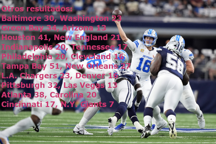 ARLINGTON, Texas, EE.UU. (AP) — Jared Goff lanzó para 315 yardas con tres touchdowns después de que su seguidilla de pases completos terminara con su primer intento, y los Lions de Detroit aplastaron 47-9 a Dallas el domingo, propinándole a los Cowboys su cuarta derrota consecutiva por amplio margen en casa.