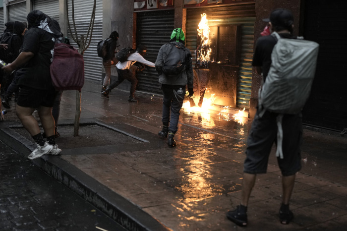 Bajo una intensa lluvia, los manifestantes se movilizaron gritando diversas consignas. Había también pancartas y fotografías de algunos de los 43 estudiantes de la Normal de Ayotzinapa que desaparecieron en el sur de México en 2014.