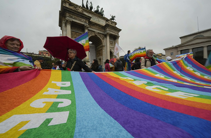 En Roma, varios miles de manifestantes marcharon ondeando una gigantesca bandera del arcoíris frente al Coliseo, y un letrero con el lema, “Detengamos las guerras. ¡El momento de la paz es ahora!”.