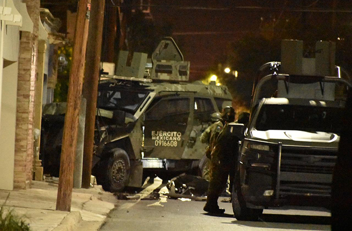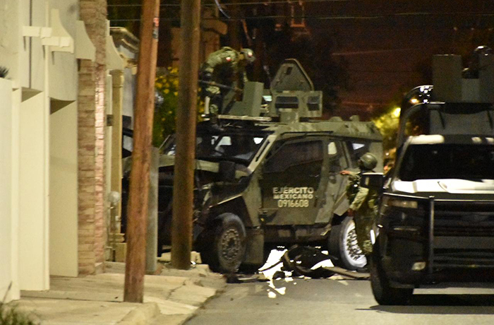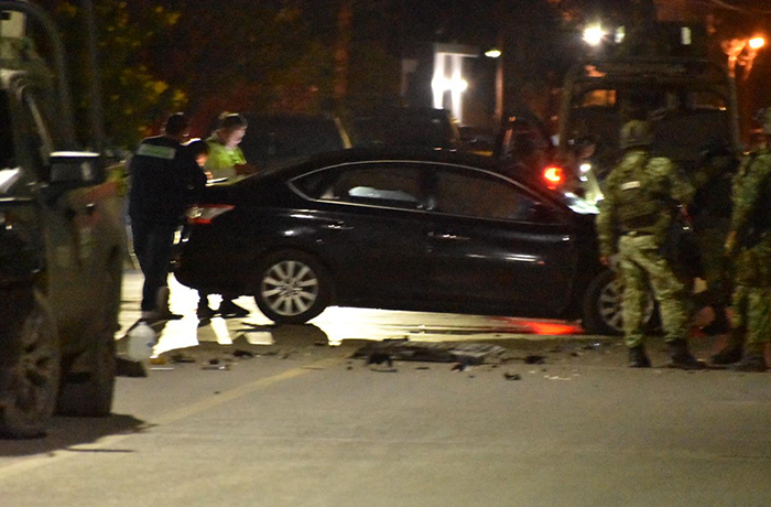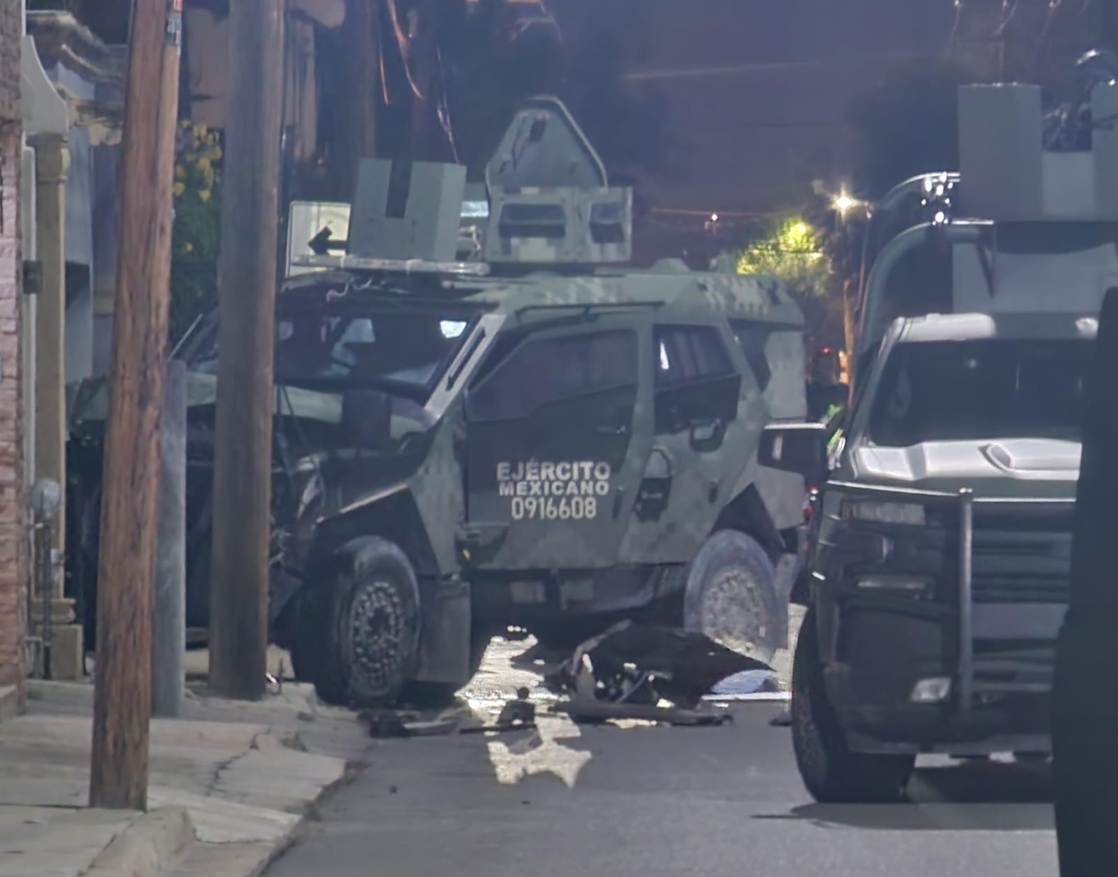 En ese momento, colisionó frontalmente con el Nissan Sentra 2014 negro, el cual se desplazaba de sur a norte por Río Guayalejo y se dirigía hacia la intersección con Anahuac. Tras la colisión inicial, el vehículo militar se proyectó hacia un portón metálico y un muro de concreto en la calle Anáhuac 2002.