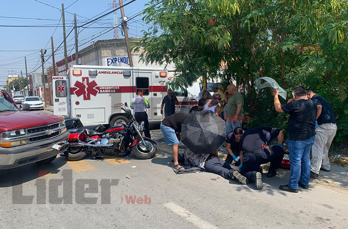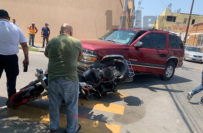 NUEVO LAREDO, TAM.- Un accidente vial tuvo lugar este martes por la tarde en el sector Centro de Nuevo Laredo, dejando a un motociclista gravemente herido tras ser embestido por una camioneta en un crucero de la ciudad.
