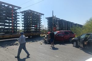 NUEVO LAREDO, TAM.- Una mujer logró escapar sin lesiones graves después de que su camioneta colisionara con un tren en un cruce ferroviario ubicado en la Carretera Anáhuac, cerca de la colonia Villas de San Miguel. El accidente ocurrió en el sector poniente de la ciudad, y se cree que el fallo en los frenos pudo haber sido la causa principal del choque.