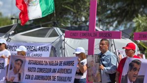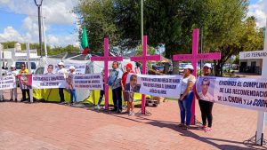 Nuevo Laredo, Tamaulipas, a 6 de Octubre del 2025.- Tres mujeres sobrevivientes de tortura por parte de la Policía Estatal y el Ejército Mexicano iniciaron este lunes una huelga de hambre frente a la Presidencia Municipal de Nuevo Laredo para exigir el cumplimiento de la Recomendación 173VG/2024 emitida hace un año por la Comisión Nacional de los Derechos Humanos (CNDH) al Secretario de Seguridad Pública de Tamaulipas.