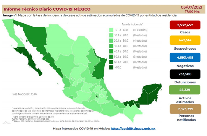 De acuerdo con el reporte técnico diario, actualmente hay 45 mil 229 casos activos estimados, es decir, personas que iniciaron con síntomas en los últimos 14 días, lo que representa el 1.7 por ciento de los casos.