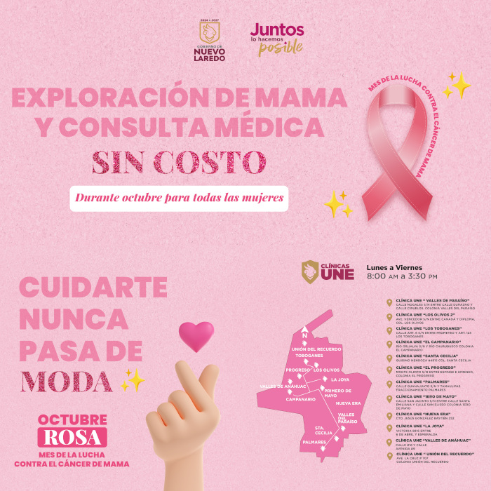 Nuevo Laredo, Tam.- En el marco de Octubre Rosa, el Gobierno Municipal de Nuevo Laredo invita a todas las mujeres a aprovechar la campaña gratuita de exploración de mama y consulta médica que se realiza en las Clínicas UNE.