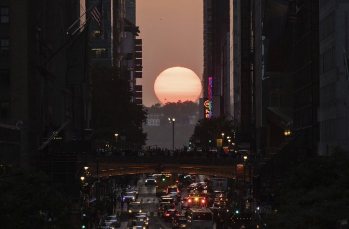 NUEVA YORK.- Dos veces al año, neoyorquinos y visitantes son testigos de un fenómeno conocido como Manhattanhenge, cuando el Sol se alinea al atardecer con la red de calles de Manhattan y se pone en el horizonte, enmarcado por una fila de rascacielos.