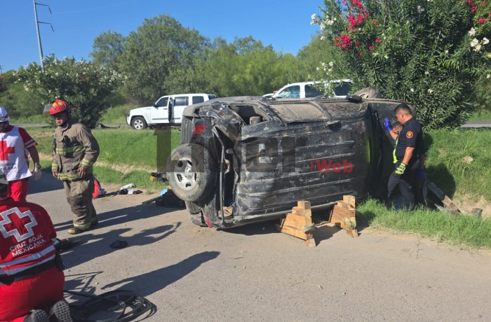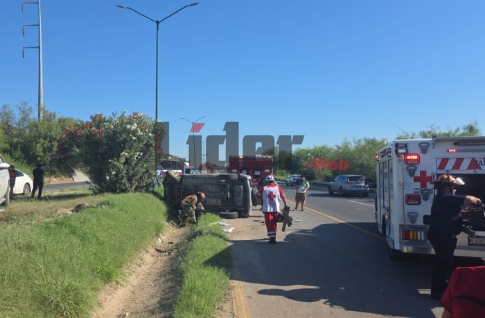 NUEVO LAREDO, TAM.- Elementos de la Dirección de Protección Civil y Bomberos, junto con paramédicos de la Cruz Roja Mexicana, auxiliaron a una mujer y a sus dos hijos luego de que la camioneta en la que viajaban volcara sobre el bulevar Luis Donaldo Colosio.
