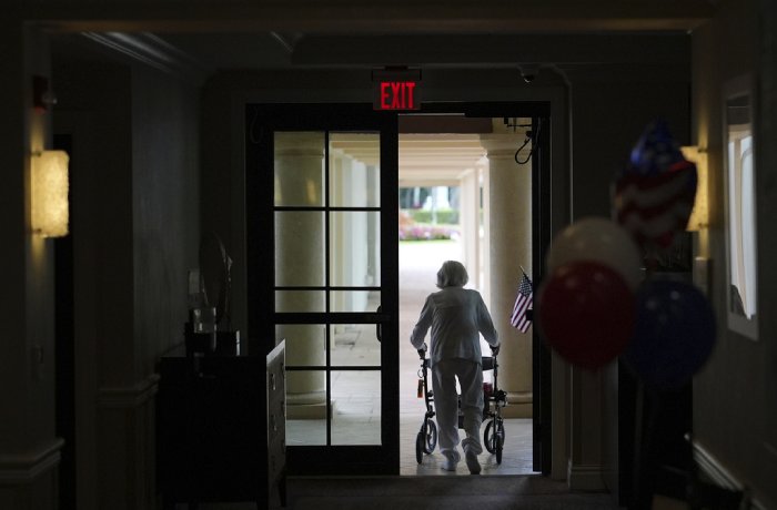 Una mujer usa una caminadora mientras sale de la residencia para ancianos Toby and Leon Cooperman Sinai Residences, el 4 de julio de 2025, en Boca Raton, Florida. (AP Foto/Rebecca Blackwell)