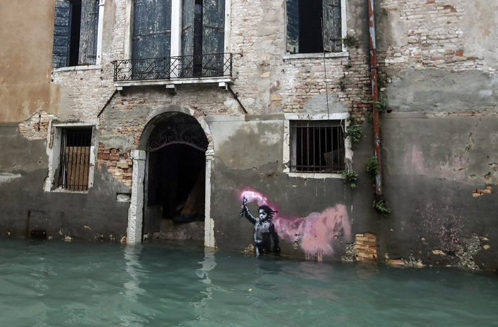 La obra que representa a un niño náufrago sosteniendo una bengala de humo rosa y vistiendo un chaleco salvavidas, apareció a la orilla del Rio di San Pantalon en Venecia en mayo de 2019, y fue reconocida por Banksy. Tras ser marcada en mapas en línea, se ha convertido en un destino turístico.