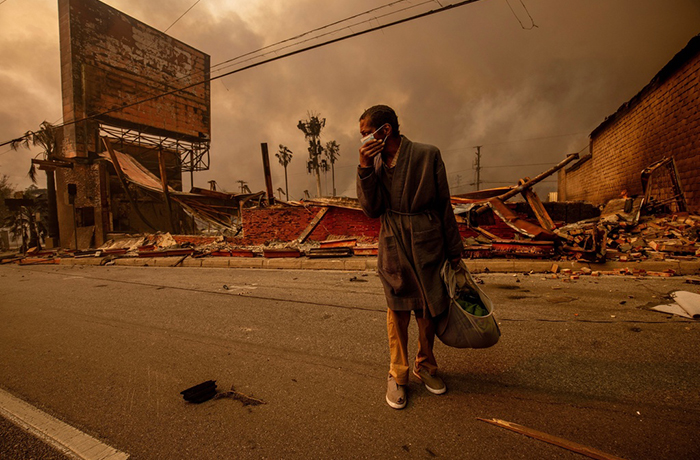 Un hombre camina frente a un negocio arrasado por el fuego tras el paso del incendio Eaton, el 8 de enero de 2025, en Altadena, California. (AP Foto/Ethan Swope, Archivo)