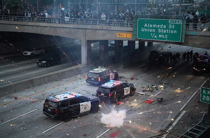 Una granada aturdidora explota en la autopista 101 cerca del centro metropolitano de detención del centro de Los Ángeles, el 8 de junio de 2025, tras una protesta contra las redadas migratorias, realizada la noche anterior. (AP Foto/Eric Thayer, Archivo)