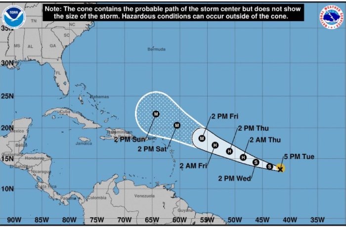 🌀Sin cambios de trayectoria, proyección pasando al noreste de la región el domingo. PR continúa fuera del cono.