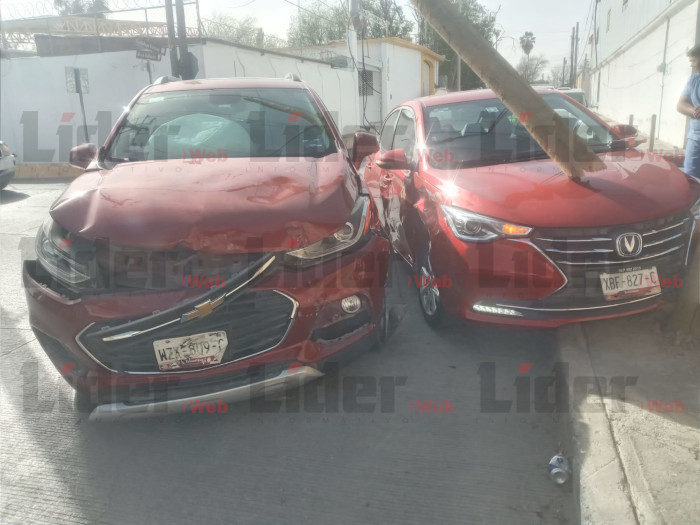 NUEVO LAREDO, TAM .- Un fuerte accidente vial registrado en el cruce de la calle Victoria y la avenida Riva Palacio dejó como saldo daños materiales en dos vehículos y un poste de madera partido en dos, reportó Tránsito Municipal. Afortunadamente, no se reportaron personas lesionadas.